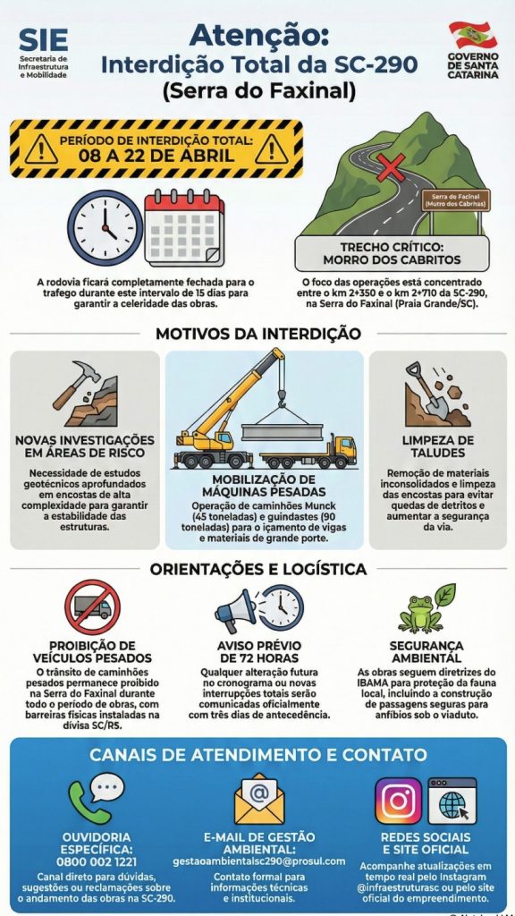 Com o intuito de conferir maior celeridade a esta etapa, bem como garantir a segurança dos usuários da via e dos operadores dos equipamentos pesados, será imprescindível a interdição total da rodovia por um período de 15 dias. Esta medida visa maximizar a qualidade técnica do projeto executivo e assegurar a efetividade das obras de contenção.